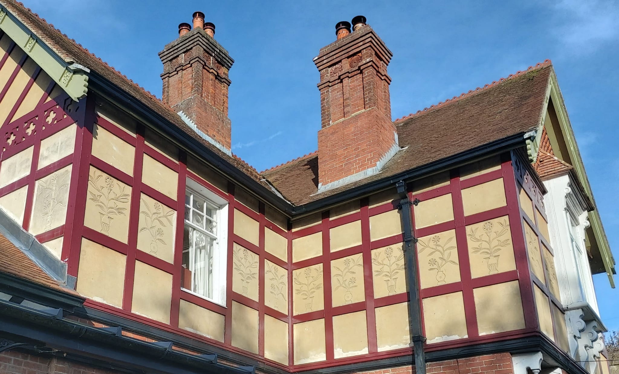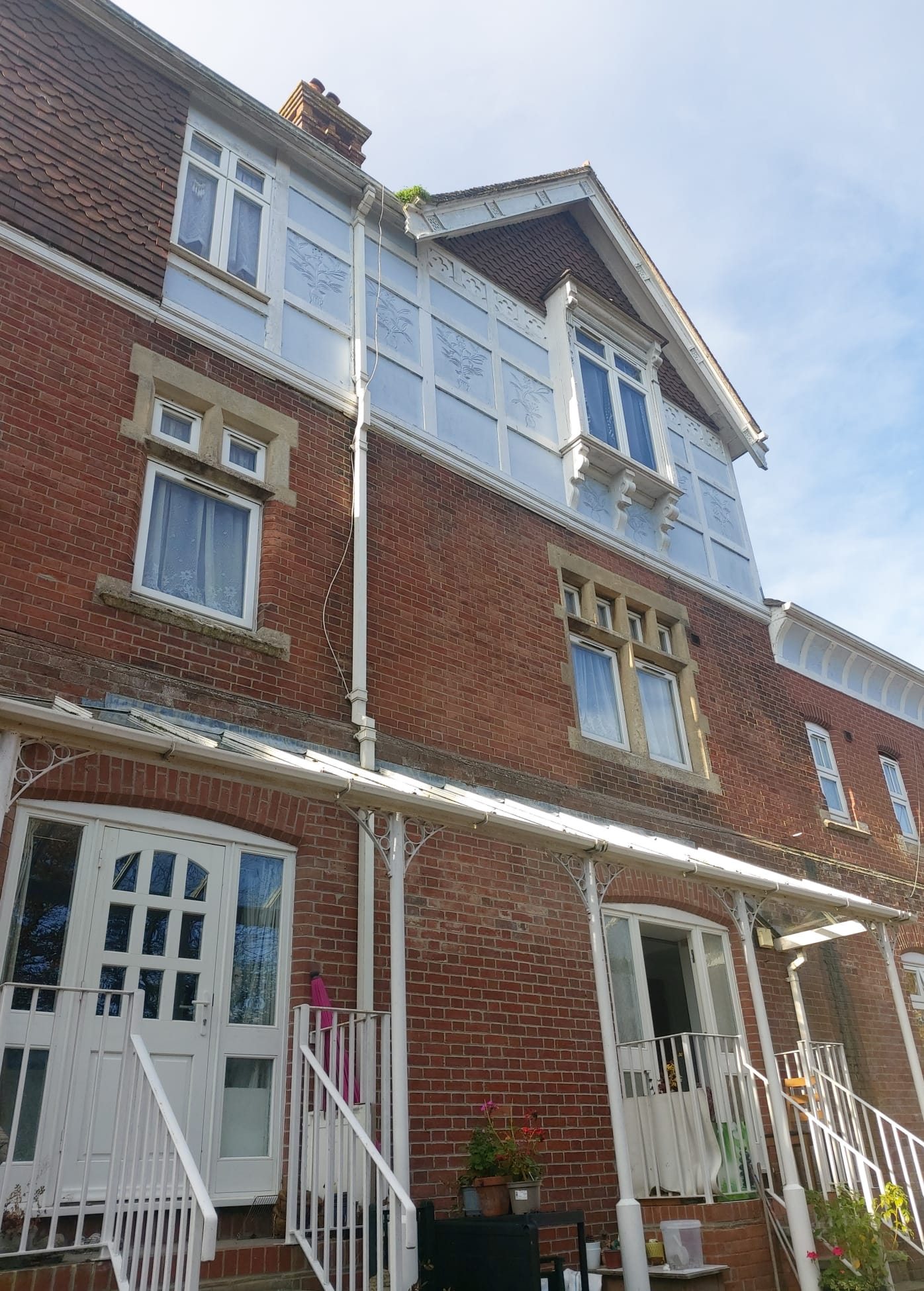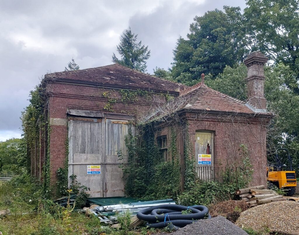 Alas, too soon our way forward was blocked: we had reached the end of the new extension. Turning round, we headed back to Singleton Station, dropping down a ramp to the side of the platforms to see the old station building – now a private residential home. In the restored rendering on the top half of the house were more of the exquisite drawings of flowers in vases, seen earlier on Lavant station.