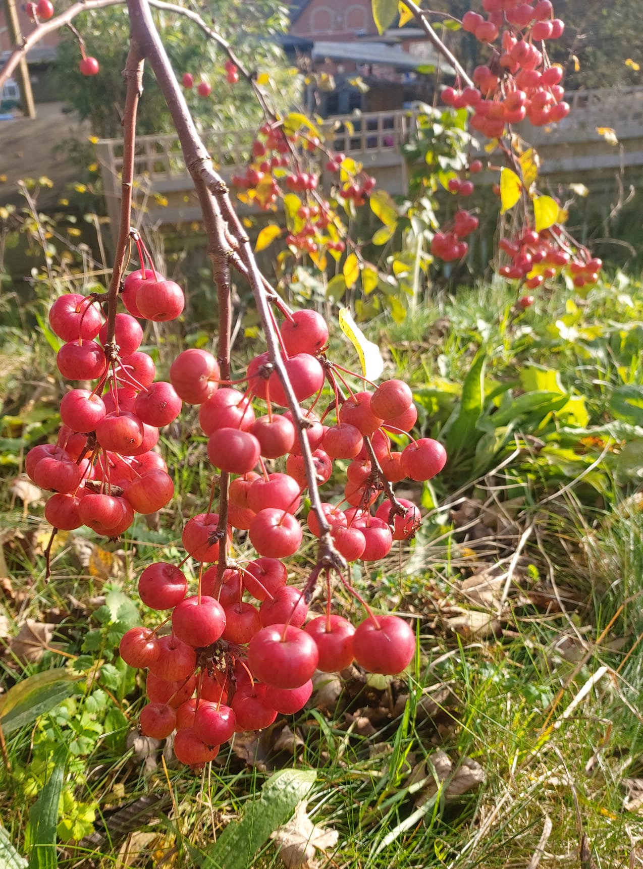 An unusually round tunnel took us under the A286 to our lunch spot; we had completed our walk of the original 5.5 miles of the Centurion Way. It was a pleasure to sit bathed in sun beside newly-planted trees weighed down by crab-apples.